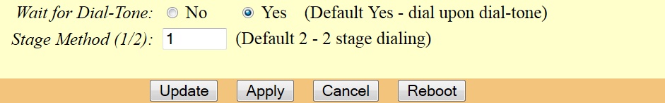 Also in the FXO section you usually want to "wait for dialtone" If NO is selected the beginning digits of the dialed number can be cut off. In most cases you will want one stage dialing. This causes the HT-503 to immediately dial the number sent to it.