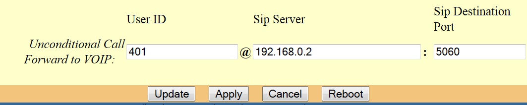 In the basic configuration section at the bottom unconditionally direct all incoming PSTN calls to the defined extension in the extensions.conf file. In my example extension 401. The IP address is the local Asterisk IP address and port is typically 5060.