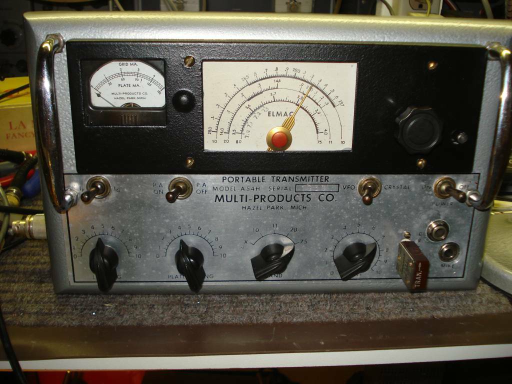 The Multi-Elmac A54 and A54H are (AM) plate modulated mobile transmitters manufactured in the early 1950's. They were VFO or crystal controlled and covered five bands, four fixed and one assignable. The fixed bands were 75, 20, 11, and 10 meters. Yes, we had the 11 meter assignment in the early 50's. The assignable or "X" position on the band switch could be field modified to any one of 160, 40, 15, or 6 meters. The final tube is an 807 with push-pull 6L6 modulators. The A54 ran on nominally 500V @ about 200 milliamps and a filament voltage of 6.3 or 12.6 volts. It was a simple but rugged design and in good shape and properly aligned these transmitters give excellent results. The A54H has a 6AU6 microphone pre-amp for use with a high impedance crystal or dynamic microphone while the A54 is designed to be used with a carbon microphone.