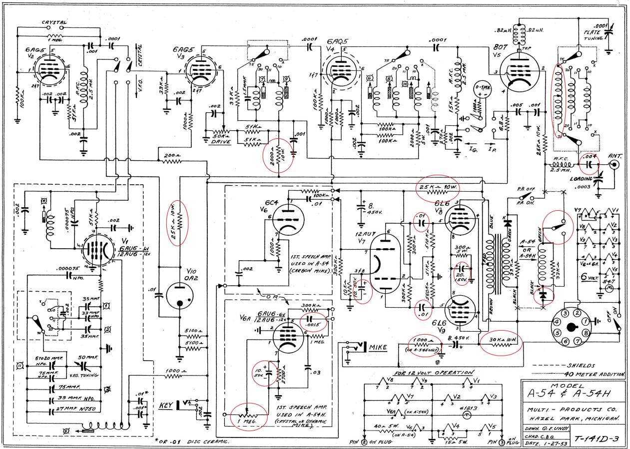 The A54 schematic showed the plate blocking capacitor and plate choke AFTER the plate tank coils allowing plate DC voltage on the coils and PA tuning capacitor. I am not sure if any were actually made that way but the one I restored had the blocking capacitor and choke right off of the plate where it traditionally and preferably is placed.